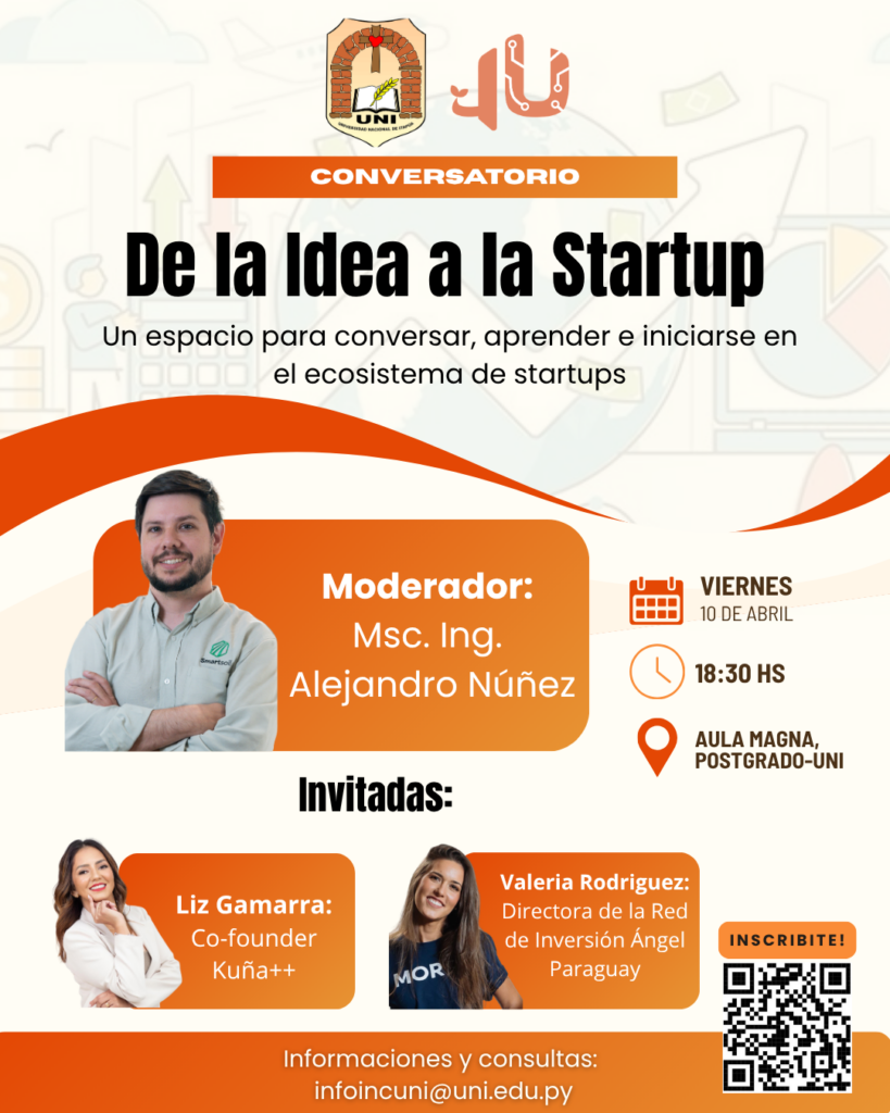La actividad contará con la moderación del MSc. Ing. Alejandro Núñez, y la participación de destacadas invitadas del ecosistema emprendedor nacional: Liz Gamarra, cofundadora de Kuña++, y Valeria Rodríguez, directora de la Red de Inversión Ángel Paraguay, quienes compartirán sus experiencias, desafíos y aprendizajes en el camino de emprender.