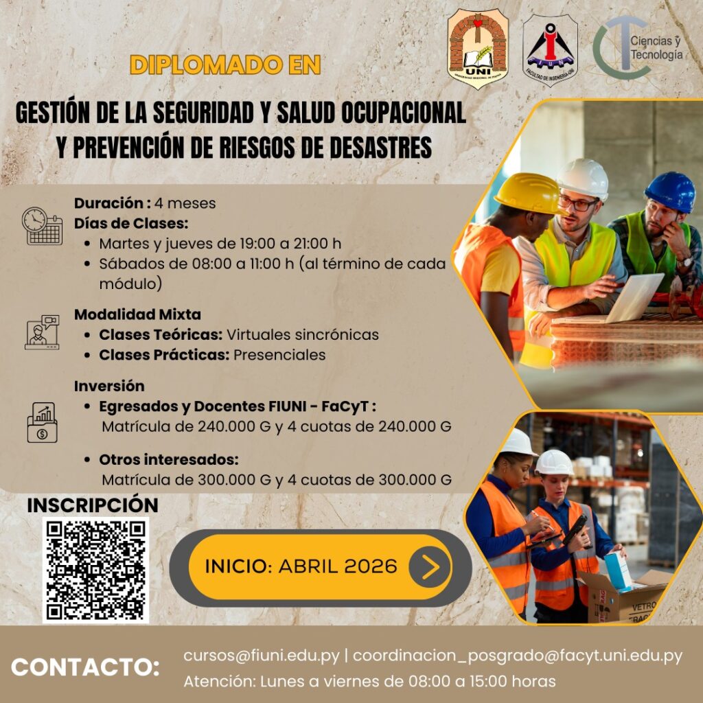 • Atención: lunes a viernes de 08:00 a 15:00 horas.Con esta propuesta, la UNI reafirma su compromiso con el avance científico y la seguridad en el entorno laboral, preparando profesionales capaces de prevenir riesgos y gestionar desastres con eficacia.