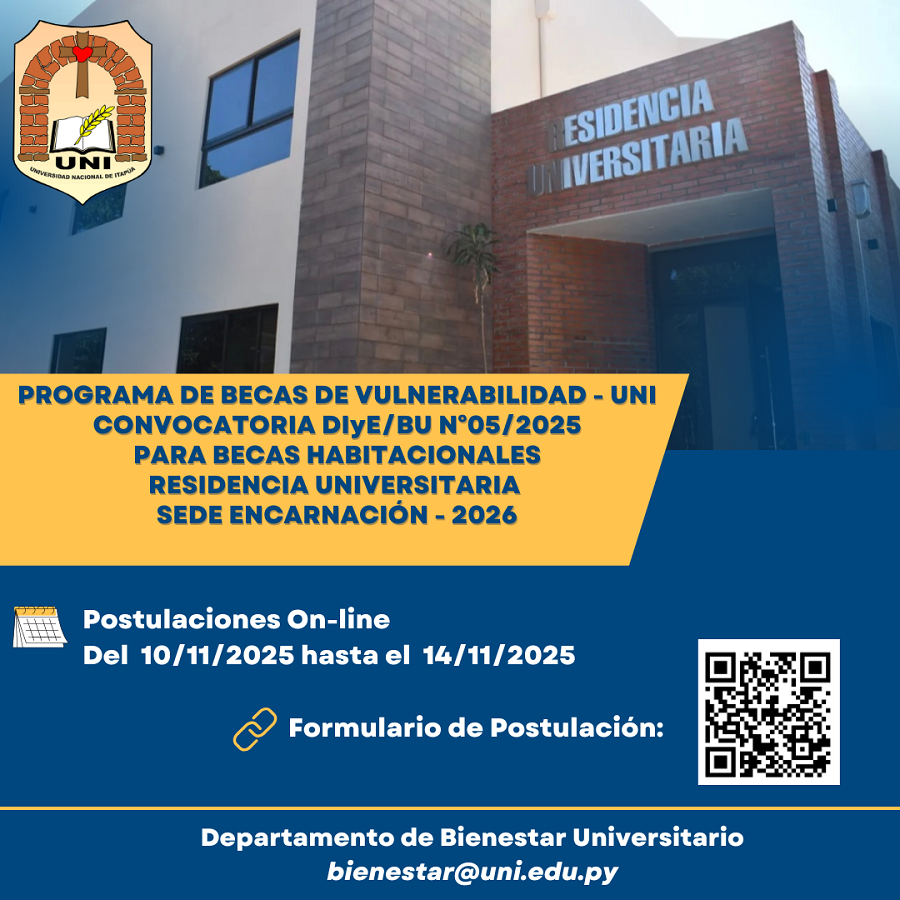 La UNI abre la Convocatoria DIyE/BU N° 05/2025 para los estudiantes interesados en ocupar la Residencia Universitaria sede Encarnación.