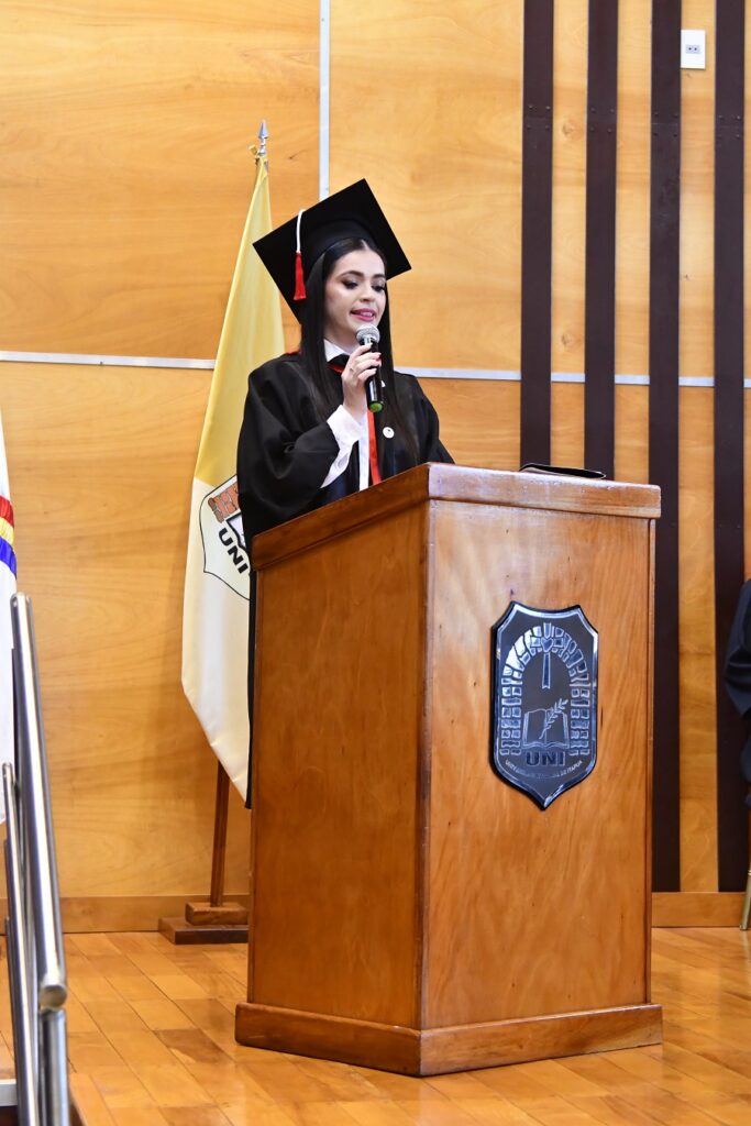 La Ing. Alba Andrea Esquivel habló en representación de los graduados de esta promoción, y bregó por “no perder la capacidad de aprender, de adaptarnos y de luchar por lo que queremos. Que sigamos avanzando con el mismo coraje que un día nos trajo hasta aquí”; afirmó con certeza.