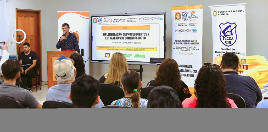 En la Sala de Posgrado de la Facultad de Ciencias Económicas y Administrativas (FaCEA) de la Universidad Nacional de Itapúa (UNI) se desarrolló con éxito el Taller de Cierre del Proyecto PINV01-124: «Implementación de procedimientos y estrategias de Comercio Justo», Caso cadena de valor de apicultores de Itapúa en torno a la empresa Flor Dorada”, ejecutado por la Facultad de Ciencias Económicas y Administrativas de la Universidad Nacional de Itapúa (UNI), con apoyo del CONACYT y el FEEI.