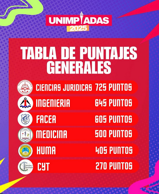 Las UNImpiadas 2025 avanzan con gran ritmo, consolidándose como un espacio de integración, esfuerzo y sana competencia, donde la juventud universitaria continúa escribiendo páginas de pasión y compañerismo en esta tradicional cita deportiva.